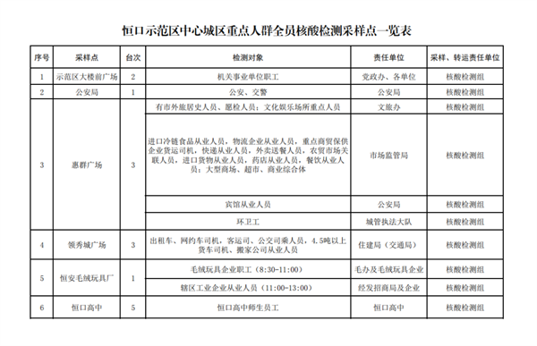 按行業(yè)、類別、區(qū)域,共設(shè)置19個(gè)采樣點(diǎn)、40個(gè)采樣臺(見附件),具體由各行業(yè)牽頭部門、責(zé)任單位統(tǒng)一安排采樣點(diǎn)設(shè)置、人員組織、秩序維護(hù),檢測對象按照牽頭部門、責(zé)任單位的具體要求,分時(shí)段有序到指定地點(diǎn)進(jìn)行采樣,避免人群聚集。