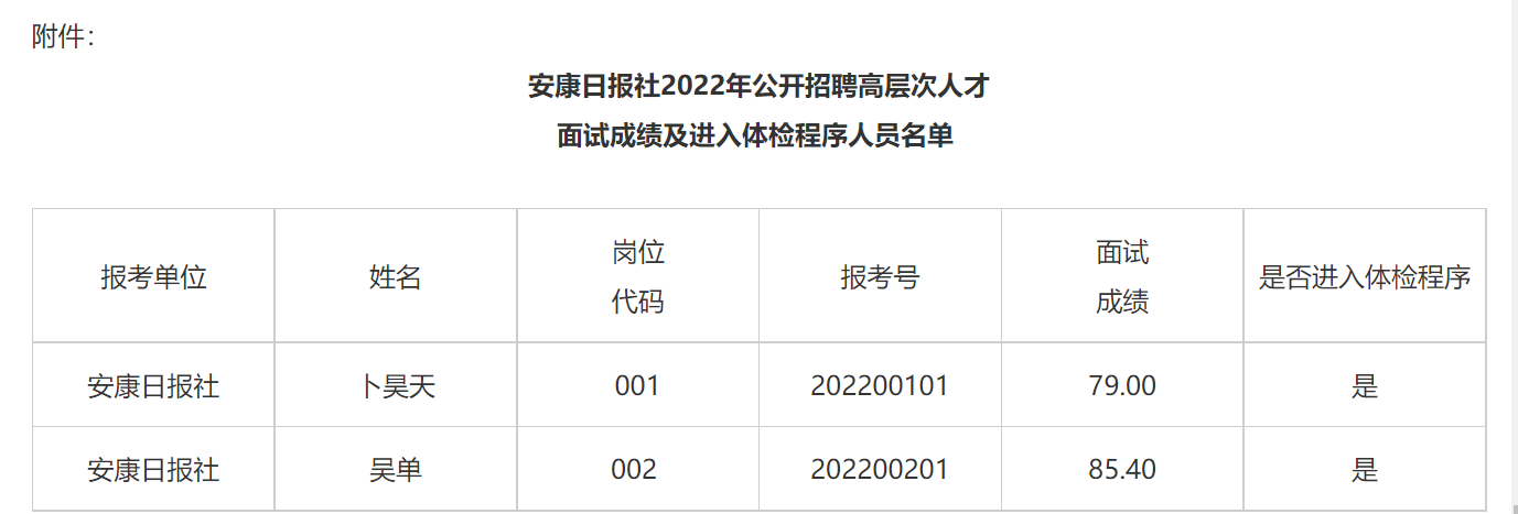 根據《安康日報社2022年公開招聘高層次人才公告》規(guī)定,現將安康日報社2022年公開招聘高層次人才面試成績及進入體檢程序人員名單(見附件)、體檢有關事項,公告如下:
