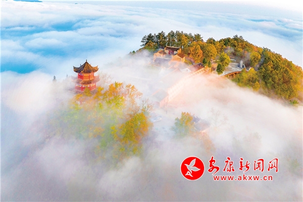 天柱山最美不過(guò)秋色,也是我在四季當(dāng)中頻繁上山的季節(jié)。每逢秋天,這里紅黃綠相間,漫山掛彩,在藍(lán)天的映襯下,多了幾分浪漫。從國(guó)道211起點(diǎn)的兩條上山公路,由數(shù)個(gè)“之”字連接起來(lái),從湖邊一直盤旋至山頂?shù)陌自乒潘拢h(yuǎn)眺仿佛一個(gè)大大的“人”字形飄帶。雨后放晴的頭兩個(gè)早晨,在云霧的籠罩下,天柱山的下半身連同湖面一并被巨大的“蠶絲被”覆蓋,山的上半身或山頭浮在云海之上,像是茫茫大海上的一座孤島。