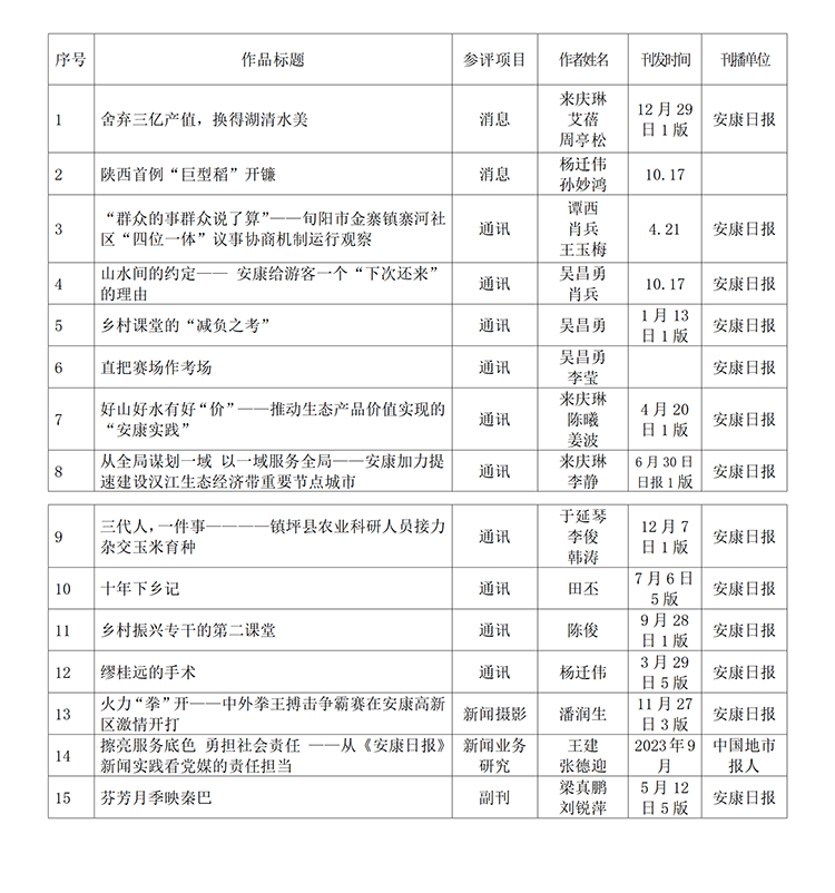 經(jīng)過(guò)1月30日編委會(huì)推薦、社黨委研究決定,擬推薦以下15件新聞作品參評(píng)2023年度“陜西新聞獎(jiǎng)”。公示時(shí)間從2024年3月6日至2024年3月12日,公示期為5個(gè)工作日。如有不同意見,請(qǐng)向安康日?qǐng)?bào)社機(jī)關(guān)紀(jì)委、新聞管理部反映。