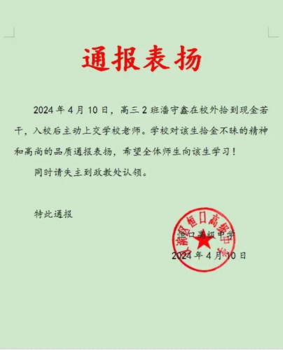 該校對潘守鑫同學(xué)拾金不昧的善舉進行了表揚,并號召全校師生學(xué)習(xí)這種拾金不昧的精神,充分發(fā)揚中華民族的傳統(tǒng)美德。