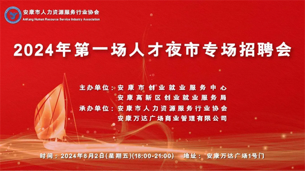 為有效保障企業(yè)用工需求,促進未就業(yè)高校畢業(yè)生、退役軍人、城鎮(zhèn)失業(yè)人員、返鄉(xiāng)農(nóng)民工等各類人員就業(yè),安康市創(chuàng)業(yè)就業(yè)服務中心、安康高新區(qū)創(chuàng)業(yè)就業(yè)服務局定于2024年8月2日(星期五)在安康高新區(qū)萬達廣場1號門舉辦2024年第一場人才夜市專場招聘會,現(xiàn)將活動事項公告如下: