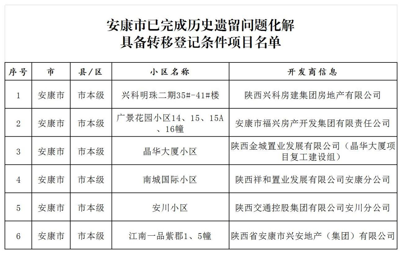 安康市市本級已完成住房領(lǐng)域不動產(chǎn)“辦證難”問題化解具備轉(zhuǎn)移登記條件項(xiàng)目名單的公告