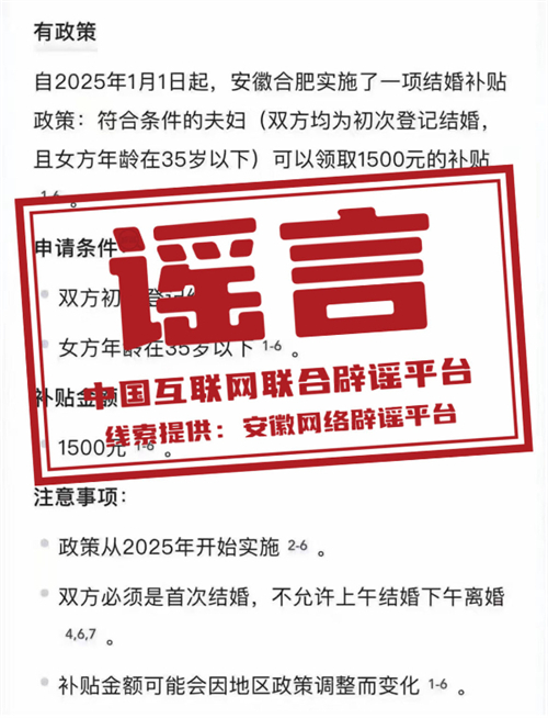真相:近日,有網(wǎng)民發(fā)布消息稱“自2025年1月1日起,安徽合肥實施結(jié)婚補貼政策”“初次結(jié)婚登記可以領(lǐng)取1500元補貼”“下載相關(guān)APP即可領(lǐng)補貼款”,引發(fā)關(guān)注。對此,合肥市民政局發(fā)布聲明稱,網(wǎng)傳消息為謠言。合肥市并未研究、出臺有關(guān)結(jié)婚登記的補貼政策,望廣大網(wǎng)民注意甄別。(來源:“安徽省互聯(lián)網(wǎng)違法和不良信息舉報”微信公眾號)