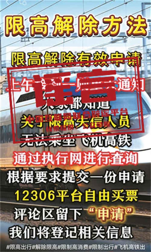 真相:近日,一些短視頻平臺頻現(xiàn)所謂“限高令新政”信息,宣稱“有內(nèi)部途徑,被限制高消費人員不用還款也能正常買機票、高鐵票”,引發(fā)關(guān)注。對此,最高人民法院執(zhí)行局相關(guān)負責人表示,關(guān)于“新政”一說實屬謠言。各級人民法院從未出臺過解除限制消費措施,或為不償還債務(wù)的限高人員提供長期“解限”的相關(guān)規(guī)定。網(wǎng)上關(guān)于對不履行生效法律文書確定義務(wù)的被執(zhí)行人解除限制消費措施等內(nèi)容均為不實信息。(來源:北京青年報)