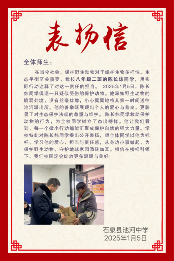 陳長煒的暖心事跡傳到學(xué)校后,學(xué)校發(fā)布了表揚(yáng)信,公開表揚(yáng)陳長煒同學(xué)的愛心善舉和保護(hù)野生動物的暖心行為。號召全體學(xué)生要學(xué)習(xí)陳長煒的愛心、責(zé)任和擔(dān)當(dāng),從小事做起,從自身做起,保護(hù)野生動植物,為保護(hù)地球家園、尊重生態(tài)文明的多樣性貢獻(xiàn)力量。?