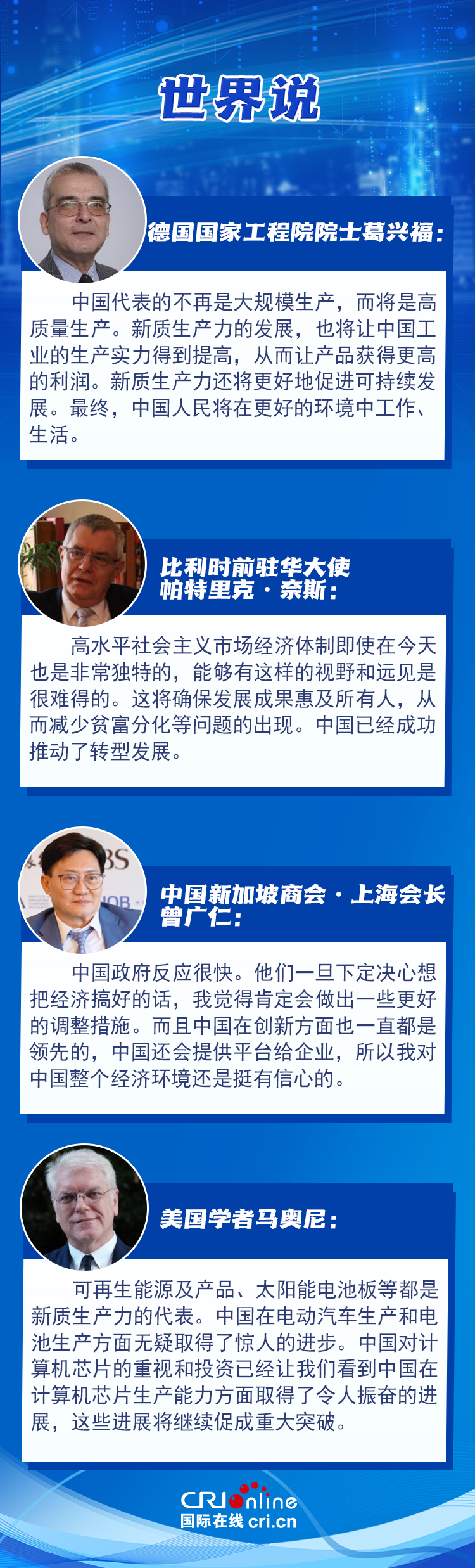 多位國際人士對(duì)中國經(jīng)濟(jì)發(fā)展充滿信心,高度肯定中國政府在經(jīng)濟(jì)發(fā)展中的核心引領(lǐng)作用,并對(duì)中國在高質(zhì)量生產(chǎn)及高精尖領(lǐng)域的創(chuàng)新領(lǐng)先地位表示贊賞。