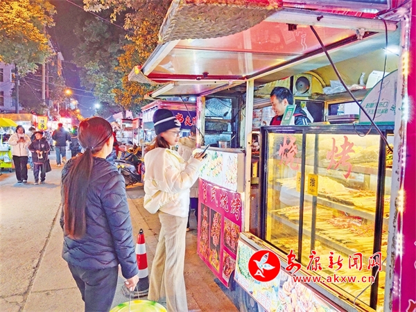暮色起,華燈上。位于縣城河街美食、建設(shè)路夜市步行街里人潮涌動(dòng),商家的吆喝聲、食客的談笑聲……融匯成夜間的熱鬧景象。不少市民和游客在這里尋味美食,有的駐足在攤位前交談、有的在品嘗美食、有的掃碼付款,在味蕾與煙火氣的碰撞之中感受著縣城的年味。