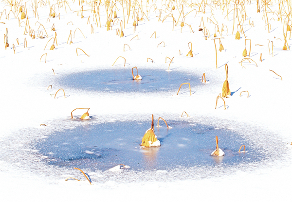 我的攝影創(chuàng)作圍繞生命的痕跡、時(shí)間的隱喻兩個(gè)主題。在《嘉實(shí)擷芳·野圃瑤音》中,菜園的微觀生態(tài)被賦予交響樂(lè)般的節(jié)奏——葫蘆藤的螺旋曲線是生命的律動(dòng),西紅柿根莖的垂直排列是生長(zhǎng)的秩序,蚜蟲蝕痕的細(xì)節(jié)則暗喻生態(tài)的共生與抗?fàn)?。而在《澄漪棹影·沙月溯光》里,榮成海岸的冬夏對(duì)比成為時(shí)間的隱喻,結(jié)冰湖面上的凋敗蓮蓬是流逝凝固的時(shí)光,夏日海邊的金色水洼則是流動(dòng)的永恒。我癡迷于捕捉這種矛盾與共生——就像用冷暖色調(diào)碰撞出畫面的張力,也用虛實(shí)構(gòu)圖處理每一張照片,期待每一張照片是個(gè)性鮮明,讓人耳目一新。