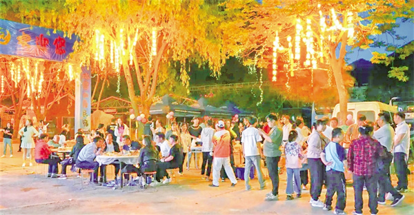 活動現(xiàn)場,本土樂隊、游客與特邀嘉賓輪番登臺,民謠、搖滾、電子樂交織回蕩。游客們圍著篝火載歌載舞,火光映紅張張笑臉。現(xiàn)場設(shè)置的文創(chuàng)產(chǎn)品和小龍蝦、燒烤等特色美食攤位更是滿足了游客的多重體驗。