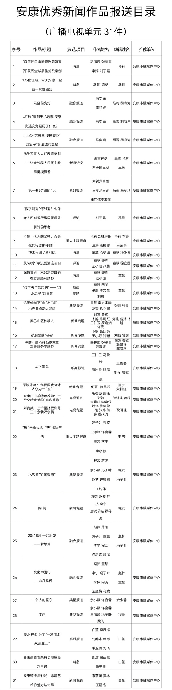 根據(jù)《關(guān)于開展2024年度安康優(yōu)秀新聞作品、安康市優(yōu)秀新聞工作者推選工作的通知》(安記協(xié)〔2025〕04號(hào))文件要求,經(jīng)推薦、領(lǐng)導(dǎo)審核,安康市融媒體中心推薦參評(píng)2024年度安康優(yōu)秀新聞作品97件(報(bào)紙單元58件,廣播電視單元31件,新媒體單元8件)?,F(xiàn)將報(bào)送作品目錄(詳見附件)予以公示。