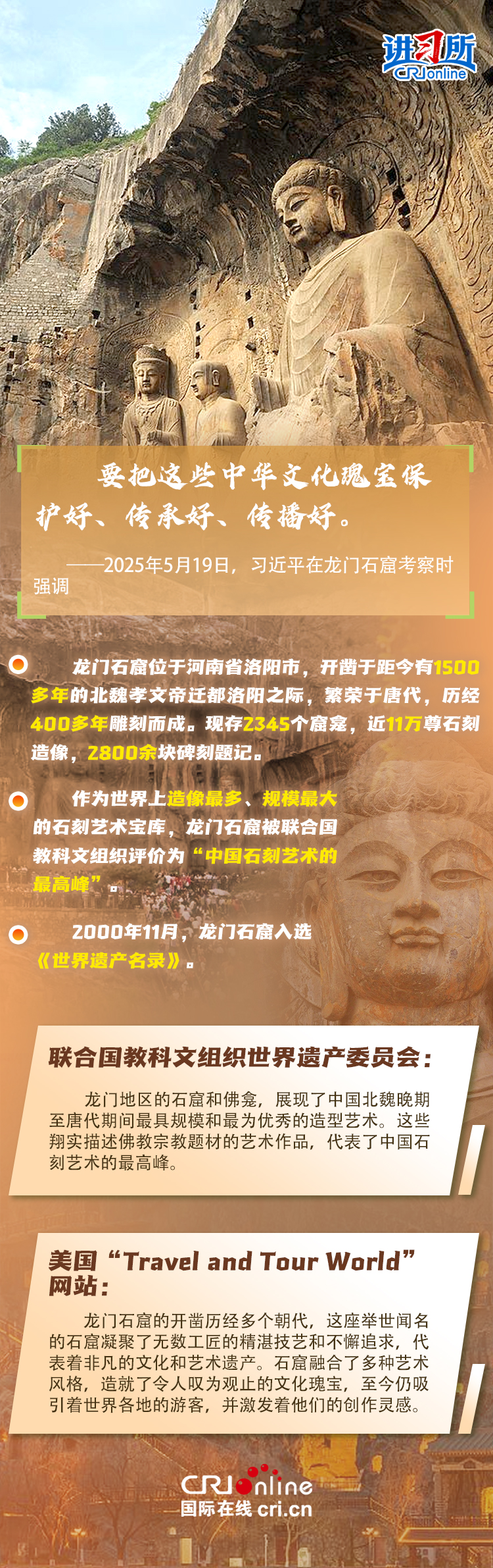 龍門石窟被聯(lián)合國教科文組織評價為“中國石刻藝術的最高峰”,與敦煌莫高窟、云岡石窟、麥積山石窟并稱為“中國四大石窟”,具有重要歷史價值、文化價值。近年來,習近平先后考察了中國四大石窟。對這些承載著中華民族文化基因和血脈的文物和文化遺產(chǎn),習近平強調(diào),“保護好、傳承好歷史文化遺產(chǎn)是對歷史負責、對人民負責?!?/p>