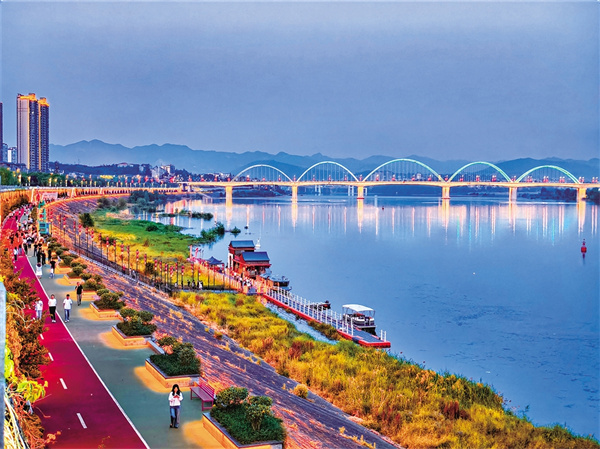 眼前的漢江是安康人的母親河,它發(fā)源于漢中市寧強縣,一路歡聲笑語,流過安康。旬陽電站建成蓄水后,這里變成安康湖,江面寬闊,碧波蕩漾。一艘漢江游船順流東下,幾艘快艇逆行沖浪。前方不遠(yuǎn)處那座彩虹橋下,一群孩子嘰嘰喳喳,正在那里學(xué)習(xí)游艇試水。漢江安康城區(qū)段過去只有一座大橋,后來先后修建了二橋、三橋、四橋。下游孩子們戲水的地方,就是東壩漢江大橋,也稱“四橋”。這座橋建得很漂亮,尤其是到了晚上,橋上的彩燈能夠變換出多種顏色,成為安康的“網(wǎng)紅橋”。