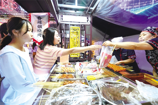 生態(tài)資源賦能場(chǎng)景體驗(yàn)。寧陜縣森林覆蓋率96.24%,居全國(guó)第一,負(fù)氧離子濃度超世衛(wèi)組織標(biāo)準(zhǔn)3倍,榮膺“中國(guó)天然氧吧”稱號(hào)。“村光大道”活動(dòng)深度嫁接生態(tài)優(yōu)勢(shì),主打“21℃的夏天·清涼寧陜”體驗(yàn),將濱河公園舞臺(tái)與山林溪流自然聲景融合,夜間山風(fēng)伴隨演出的沉浸式場(chǎng)景獲游客好評(píng)。同步開設(shè)的“秦嶺山珍大集”“有好市小吃一條街”30余個(gè)展位展銷寧陜臘肉、羊肚菌、香菇;美食區(qū)現(xiàn)做洋芋糍粑、玉米鍋巴、麻辣豆腐干吸引游客頻頻駐足,形成“觀演+嘗鮮”閉環(huán)體驗(yàn)。