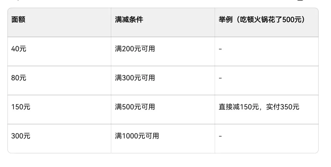 300元面額,餐飲消費(fèi)滿(mǎn)1000元每次抵用一張。