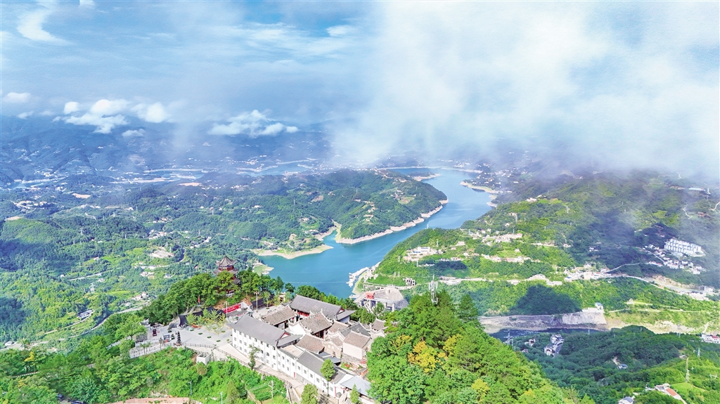 8月14日清晨,站在瀛湖風景區(qū)內(nèi)遠眺,遠山、村莊相互映襯,風景如畫。趙華斌 攝
