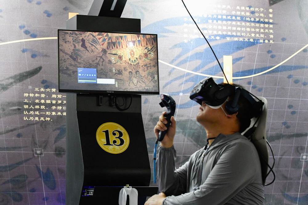 ??2024年7月22日,一名游客在敦煌莫高窟“尋境敦煌——數(shù)字敦煌沉浸展”上借助VR設(shè)備沉浸式游覽莫高窟第285窟虛擬場(chǎng)景。“尋境敦煌”綜合運(yùn)用了VR虛擬現(xiàn)實(shí)、三維建模、游戲引擎的物理渲染和全局動(dòng)態(tài)光照等新技術(shù),高精度立體還原了莫高窟第285窟。游客戴上VR眼鏡,不僅可以零距離觀賞壁畫(huà)、360度自由探索洞窟細(xì)節(jié),還能“飛升”到窟頂,身臨其境參與壁畫(huà)故事情節(jié),沉浸式感受敦煌文化的魅力。