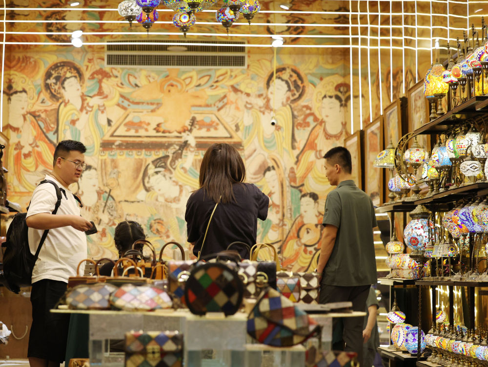 ??2025年6月26日,游客在敦煌夜市選購(gòu)文創(chuàng)產(chǎn)品。今年以來(lái),敦煌市全面改造敦煌夜市等特色街區(qū),圍繞敦煌深厚的歷史文化底蘊(yùn),融入壁畫(huà)、絲路文化等元素,通過(guò)布設(shè)文化景觀小品、打造沉浸式餐飲體驗(yàn)空間、上線特色文創(chuàng)產(chǎn)品等方式,給游客帶來(lái)多元體驗(yàn),“夜經(jīng)濟(jì)”持續(xù)升溫,不斷釋放文旅消費(fèi)潛力。