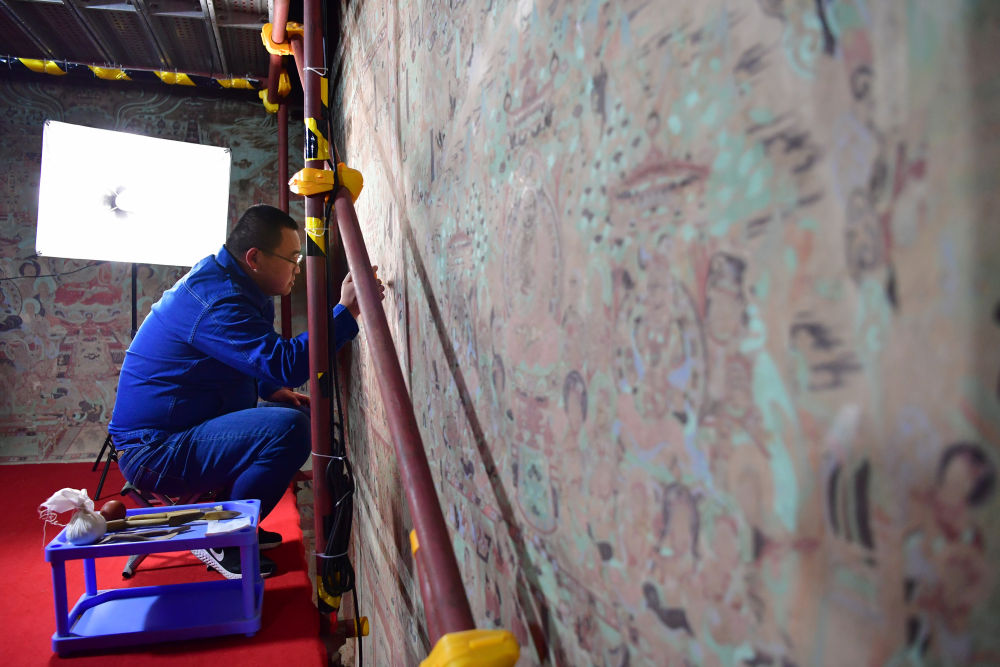 ??2022年4月19日,敦煌研究院文物保護(hù)技術(shù)服務(wù)中心的壁畫(huà)修復(fù)師楊金禮在莫高窟第231窟內(nèi)修復(fù)壁畫(huà)。