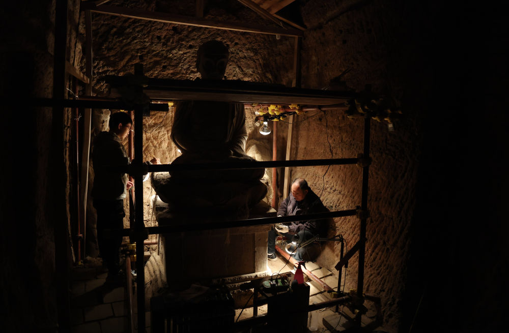 ??2024年11月2日,麥積山石窟藝術(shù)研究所保護(hù)研究室的高級(jí)文物修復(fù)師牟常有(右)和徒弟何舉在麥積山石窟133窟內(nèi)修復(fù)塑像。自1985年至今,牟常有在麥積山石窟藝術(shù)研究所工作已有四十年。經(jīng)過(guò)多年磨礪,牟常有的文物修復(fù)技藝日臻成熟,面對(duì)年輕人的請(qǐng)教,他更是傾囊相授。“塑像壁畫(huà)皆是凝固的歷史,守護(hù)它們,需要耐心和毅力,相信年輕人能夠接好接力棒,讓這份珍貴的人類(lèi)文化遺產(chǎn)永續(xù)。”牟常有說(shuō)。