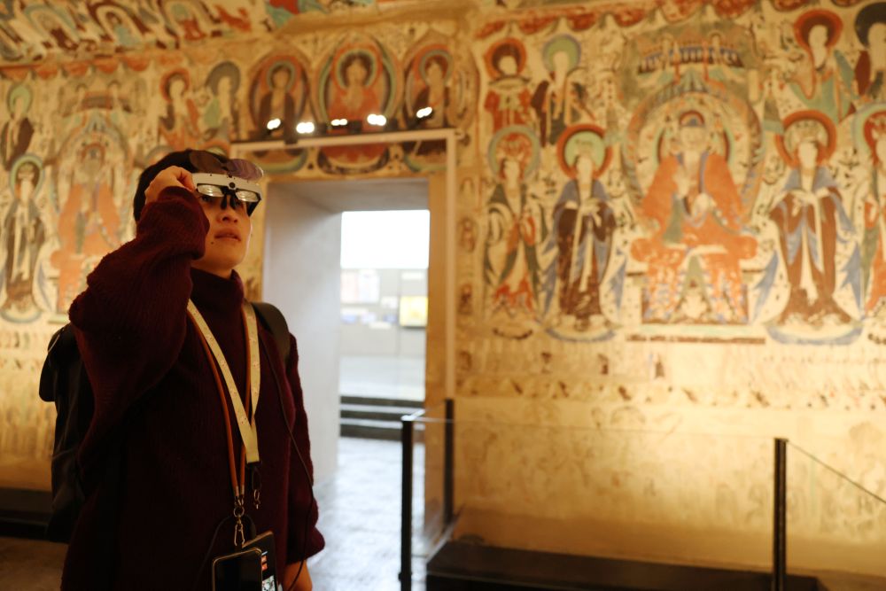 ??2025年10月30日,在敦煌石窟文物保護(hù)研究陳列中心,游客使用AR設(shè)備在復(fù)制洞窟參觀體驗(yàn)。