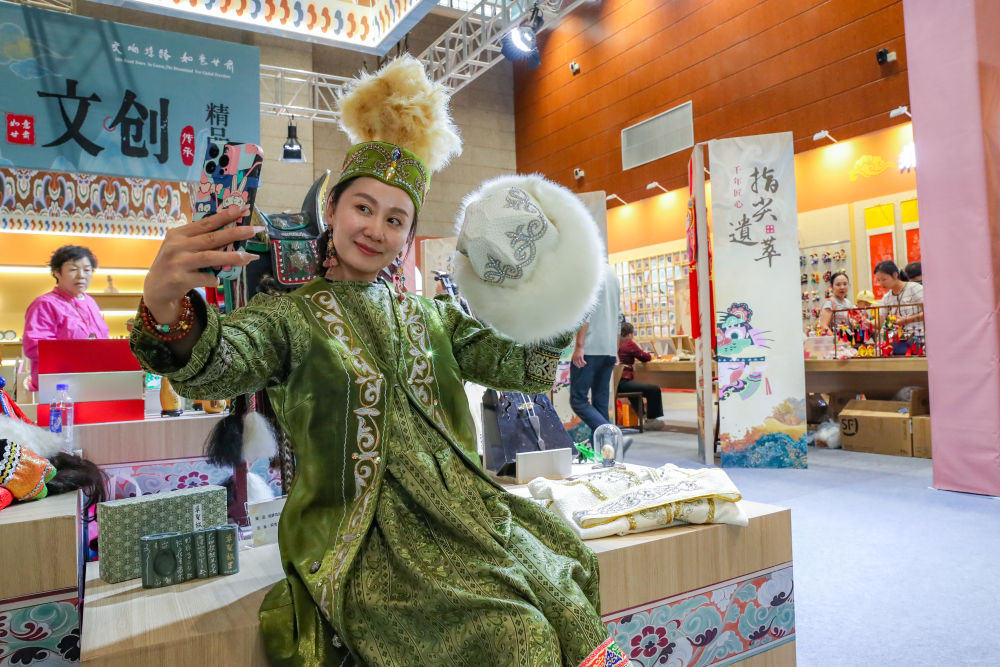 ??2025年9月22日,游客在敦煌文博會(huì)上身穿民族服飾自拍。9月20日至22日,第八屆絲綢之路(敦煌)國(guó)際文化博覽會(huì)在敦煌市舉行。敦煌研究院“典范”“高地”建設(shè)成果展、甘肅文旅非遺文創(chuàng)展、敦煌·絲路雕塑展等多項(xiàng)展覽同步亮相,集中展現(xiàn)了敦煌文化遺產(chǎn)保護(hù)、研究、弘揚(yáng)的最新成果以及共建“一帶一路”國(guó)家的文化藝術(shù)、非遺文創(chuàng)、風(fēng)土人情等精彩內(nèi)容。