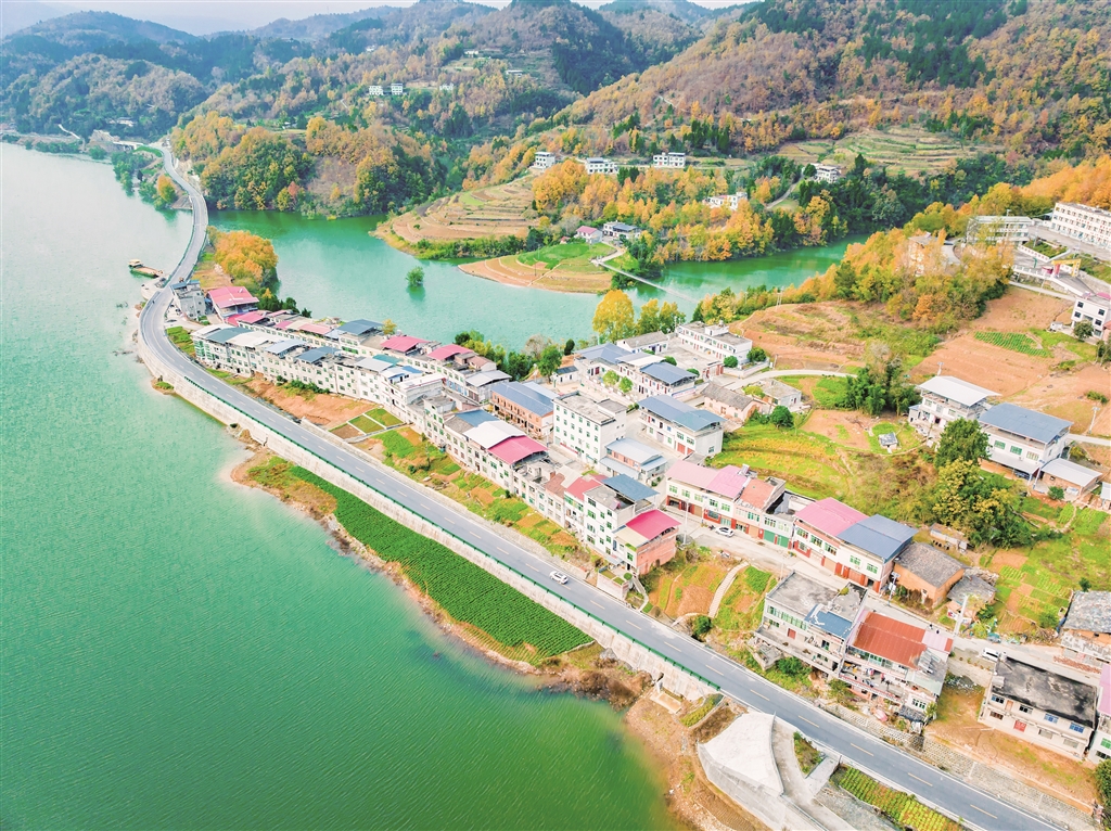 夕陽下的沙坪河,斑斕山林與澄澈水色繪就成一幅靈動的水鄉(xiāng)畫卷。郭浩 攝