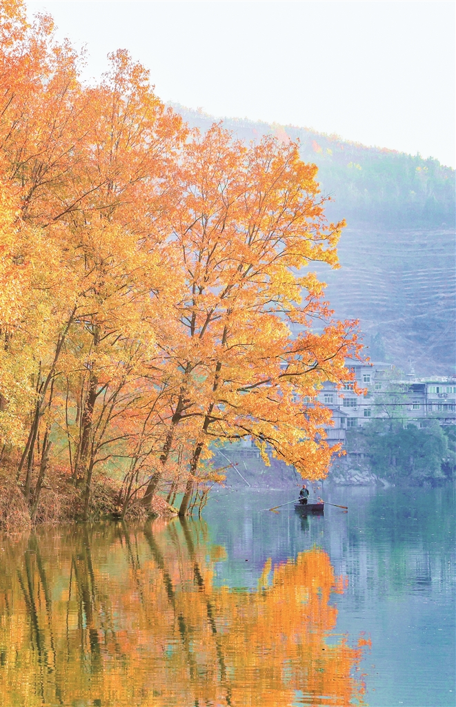 待到霧散天青,沙坪河便展露出它清澈的容顏。兩岸層林盡染,漫山的斑斕都被河水溫柔收納。一川碧水如鏡,完整復(fù)刻出天空與彩林的倒影,虛實交錯,舟行其上,仿佛滑入一幅靜止的油畫。山偎著水,水映著山,靜謐而又絢爛。?