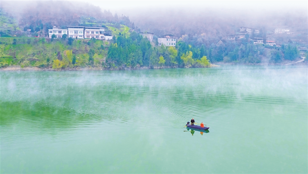 寒冬時節(jié),瀛湖蓄水,沙坪河展現(xiàn)出不同往昔的靜謐風姿。清晨,薄霧如紗,輕輕覆于江面。遠山輪廓在氤氳中淡去,近水卻愈顯澄明,倒映著天際微光。時有早行的客船從霧中緩緩現(xiàn)出身形,馬達聲不時驚起三兩水鳥;漁人輕搖小舟,如在云中穿行。這朦朧流動的晨景,恍若水墨漫染的仙境。