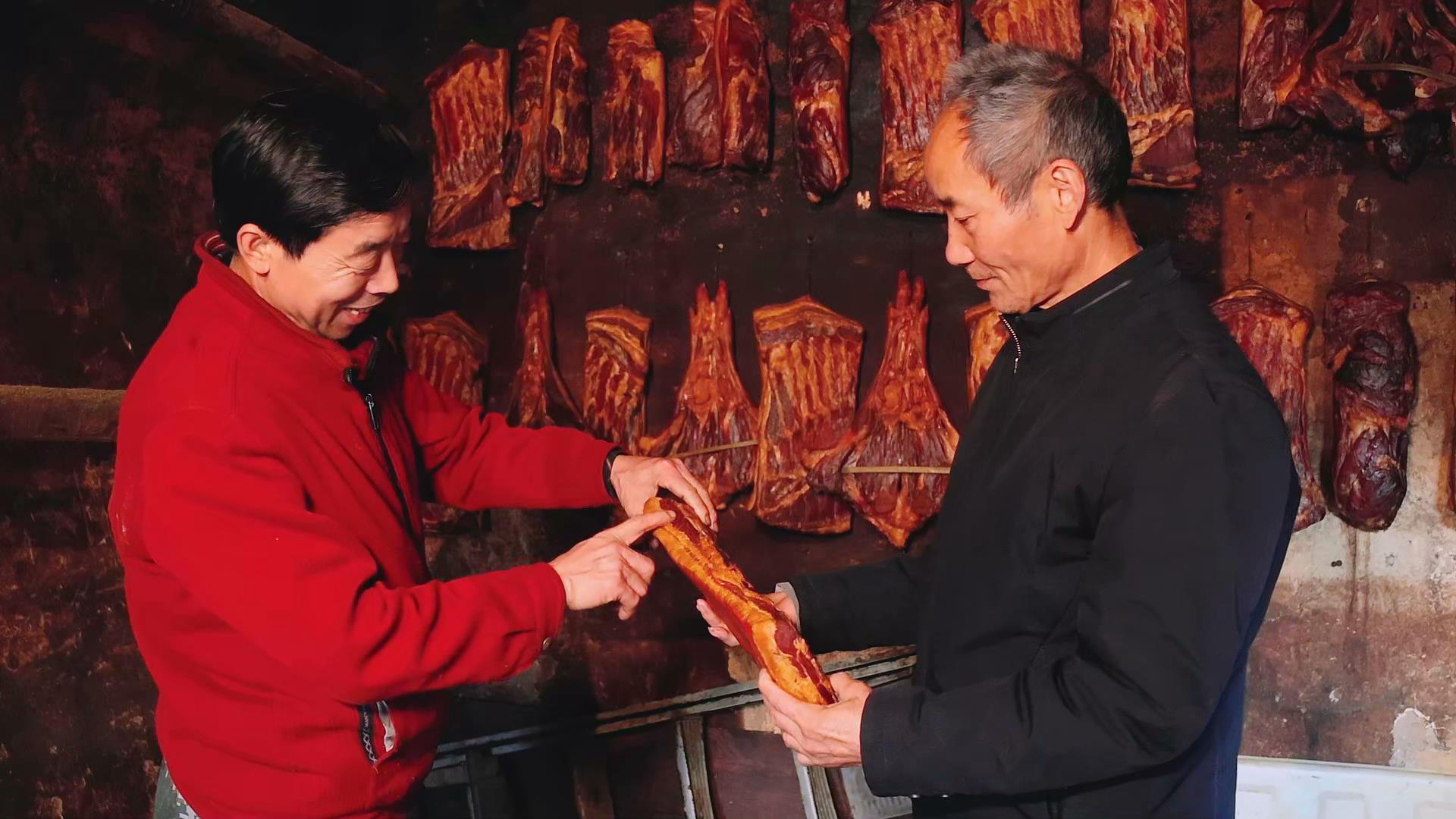 石泉縣城關(guān)鎮(zhèn)珍珠河村村民王全勇(左)熏制臘肉已有十來年,是當(dāng)?shù)赜忻呐D味制作能手。今年,他熏制的上萬斤臘肉和香腸早早就被預(yù)訂,有的還通過網(wǎng)絡(luò)被賣到北京、山東等省市。 郭依萍 攝