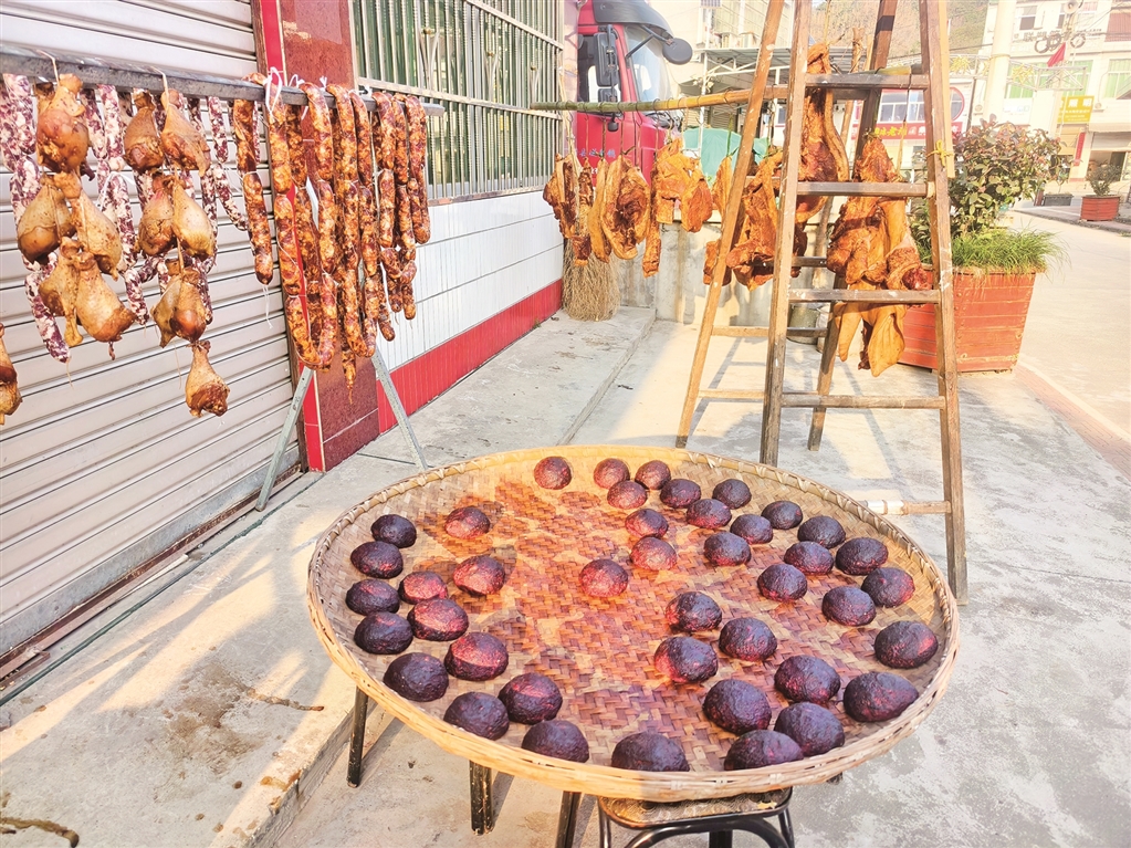城關鎮(zhèn)作為漢陰縣的農業(yè)大鎮(zhèn)與文旅活鎮(zhèn),轄區(qū)內30個村(社區(qū))的農戶們,把冬腌臘肉視作過年的重要儀式?!靶⊙┻^后腌臘肉,開春都香!”平安村村民李師傅笑著介紹,他家養(yǎng)的本地土豬是吃野菜、粗糧長大的,肉質緊實肥瘦相間,是成就臘味醇香的基礎。每年他都會沿襲祖輩的制作工藝,將新鮮五花肉和后腿肉,用麻繩系好瀝干水分,再用粗鹽混合本地花椒、八角等香料逐塊揉搓,確保味道滲進肌理,然后將腌好的肉壓上青石板,在陰涼通風處靜置三五天,每日翻動保證均勻入味,再經(jīng)過二十天的晾曬,方可完成。制好的臘肉切開后瘦肉呈瑪瑙紅色,肥肉如琥珀色,香氣撲鼻。