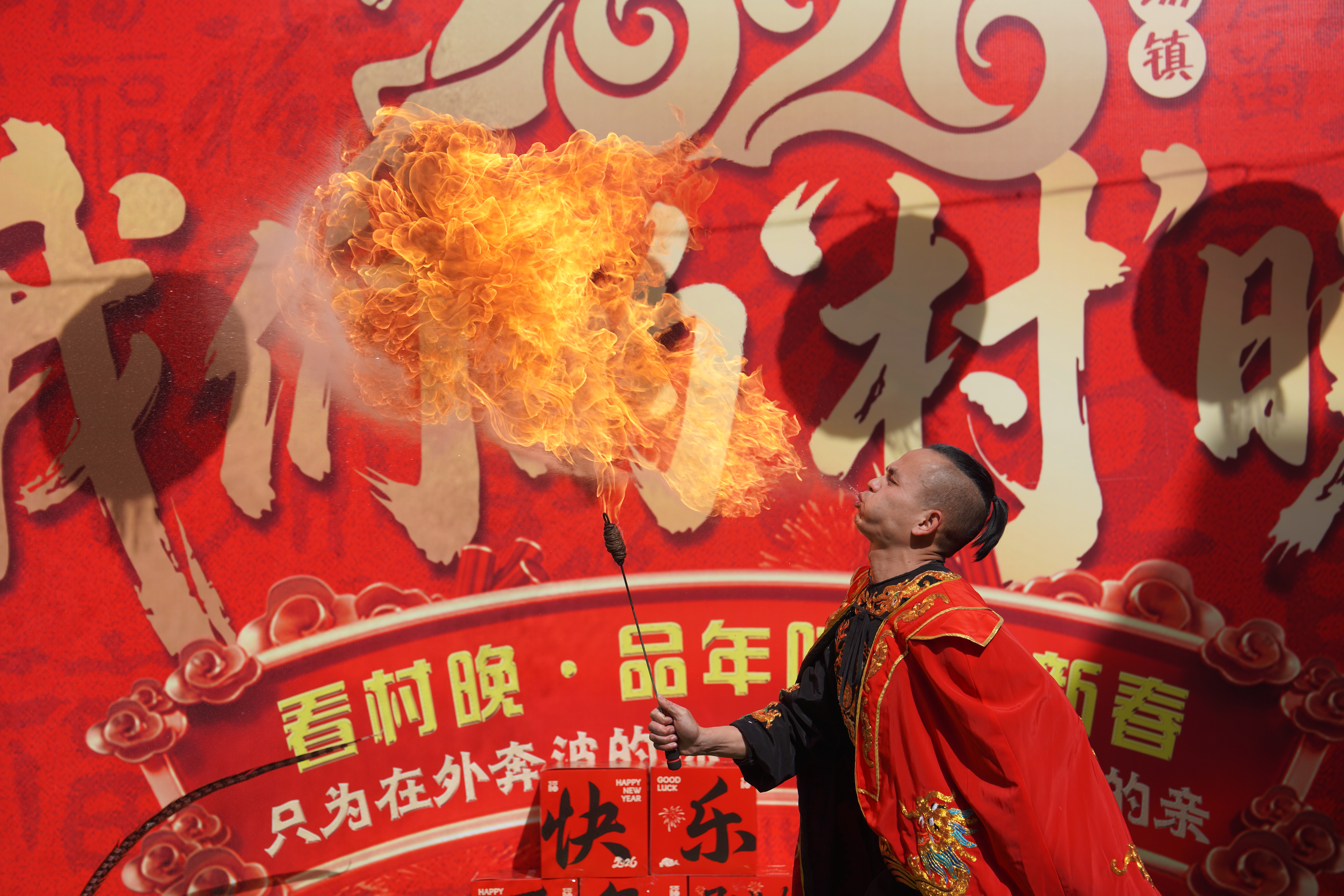 △ 2月2日,演職人員在新場(chǎng)鎮(zhèn)“村晚”舞臺(tái)上進(jìn)行特技表演。