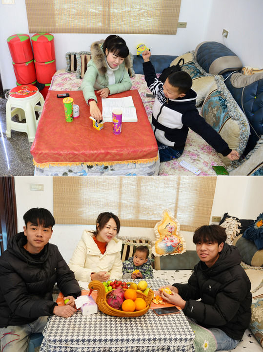拼版照片:上圖為安康市紫陽縣蒿坪鎮(zhèn)黃金村村民雷潔(左)在易地搬遷后的新家中給大兒子張明澤輔導(dǎo)功課(2017年2月9日攝);下圖為雷潔(左二)和她的大兒子張明澤(右一)、二兒子張明懿(左一)、小兒子張翰瑞(右二)在同一地點(diǎn)合影(2026年1月30日攝)。