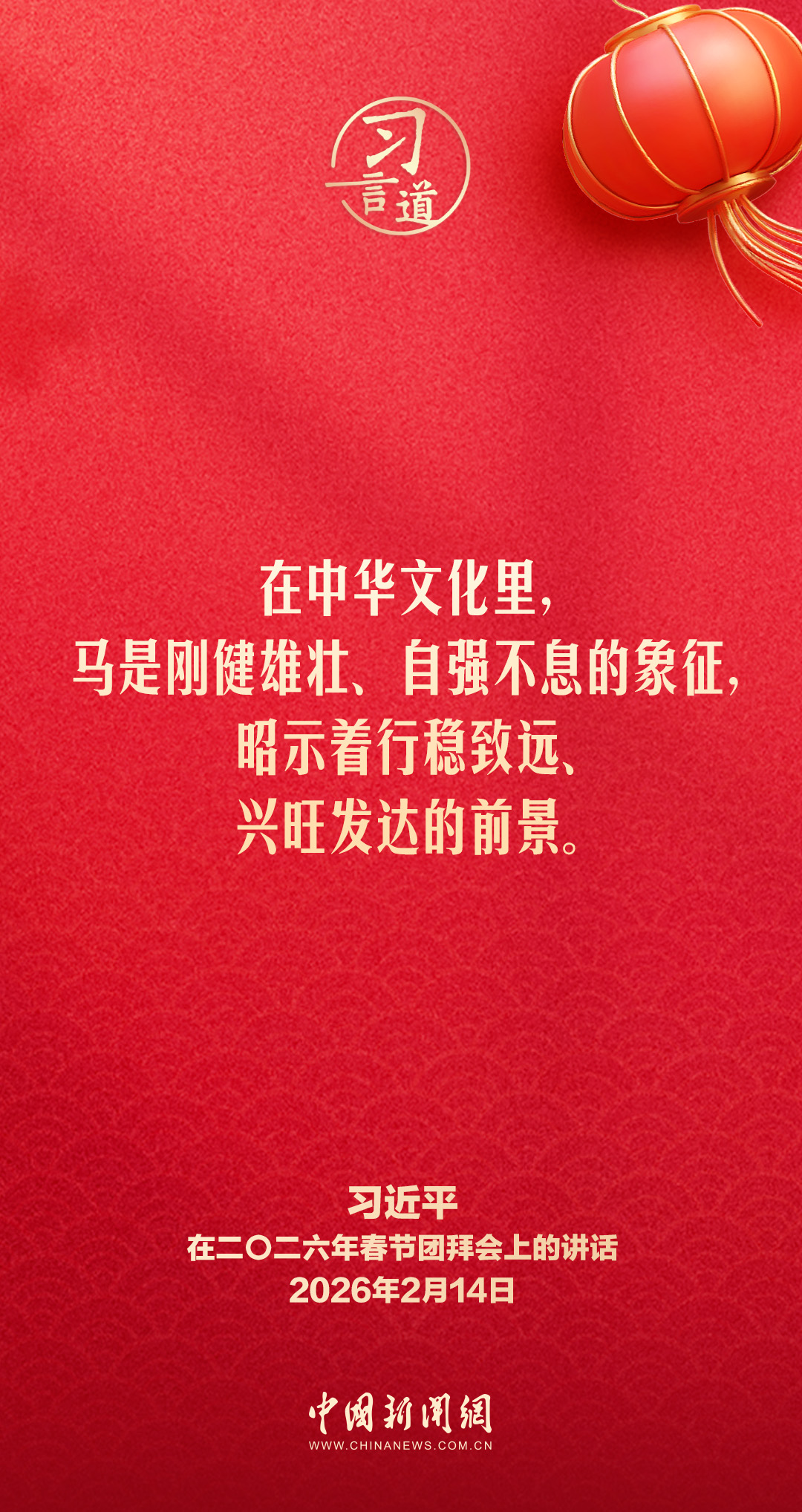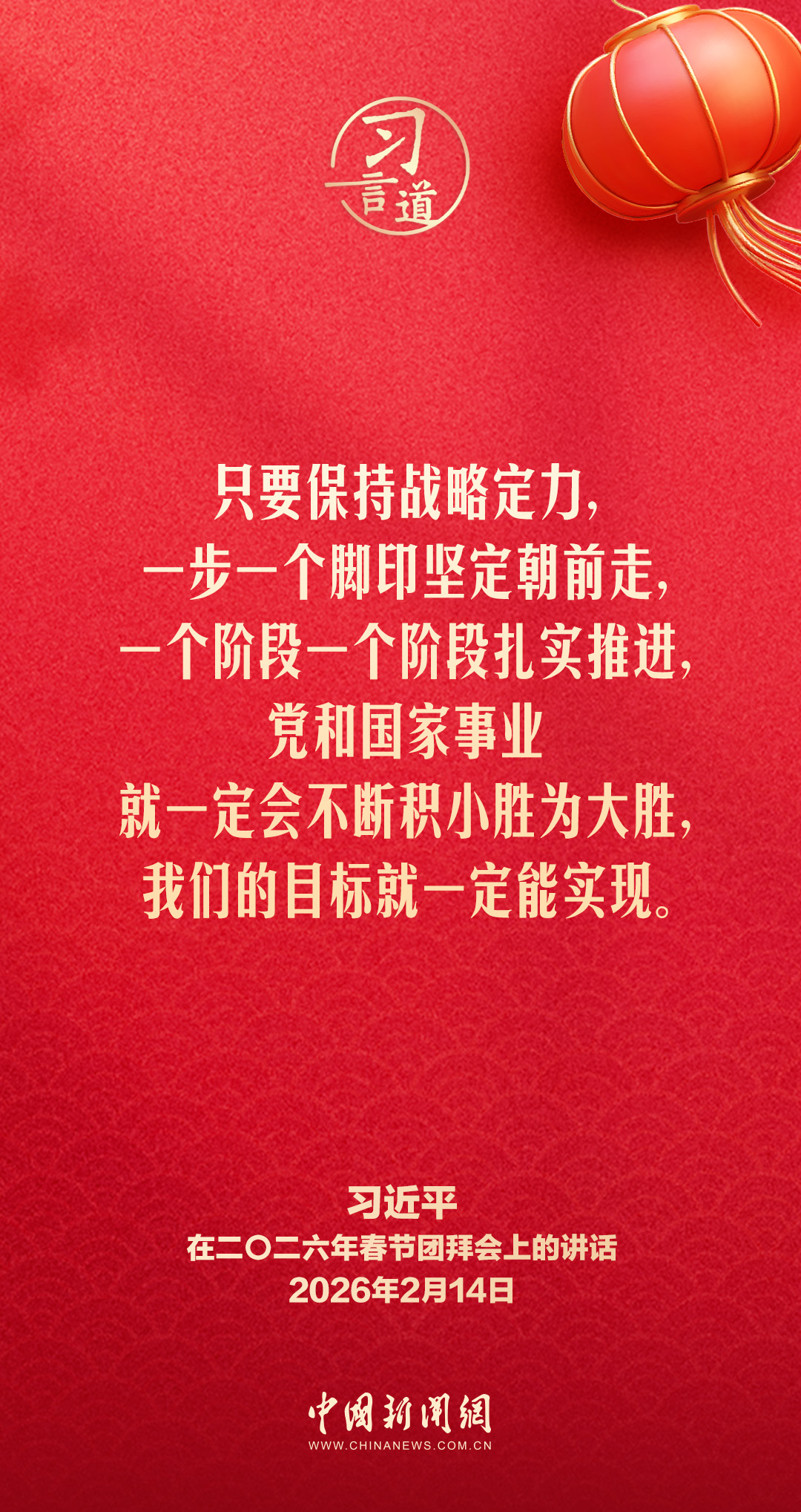 2月14日,中共中央、國務院在人民大會堂舉行2026年春節(jié)團拜會。中共中央總書記、國家主席、中央軍委主席習近平發(fā)表講話,代表黨中央和國務院,向全國各族人民,向香港特別行政區(qū)同胞、澳門特別行政區(qū)同胞、臺灣同胞和海外僑胞拜年。他指出——