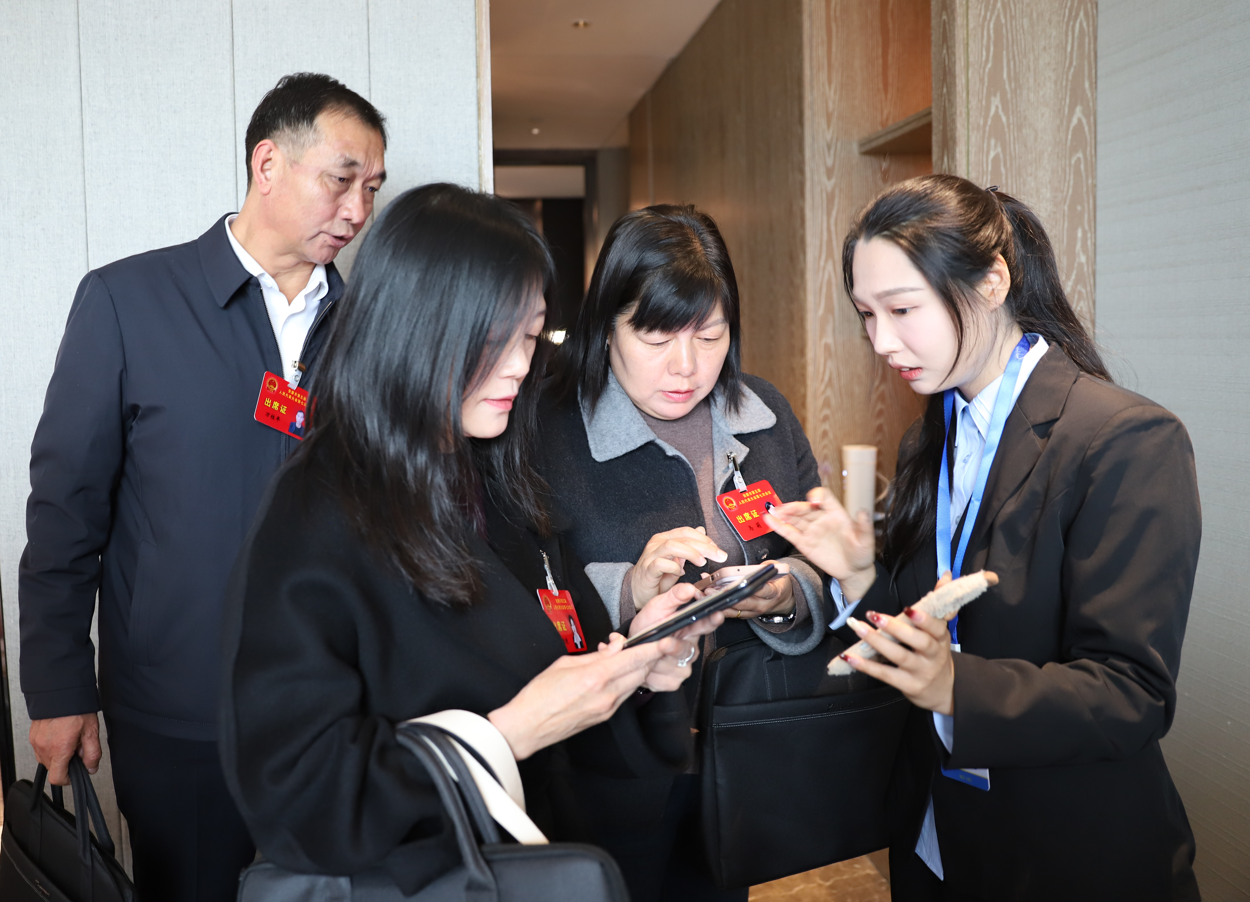 2月27日上午,出席市五屆人大七次會(huì)議的人大代表陸續(xù)抵達(dá)駐地向大會(huì)報(bào)到。圖為現(xiàn)場(chǎng)工作人員向代表們演示新上線(xiàn)的“安康數(shù)字人大”微信小程序。記者 魏濤 攝