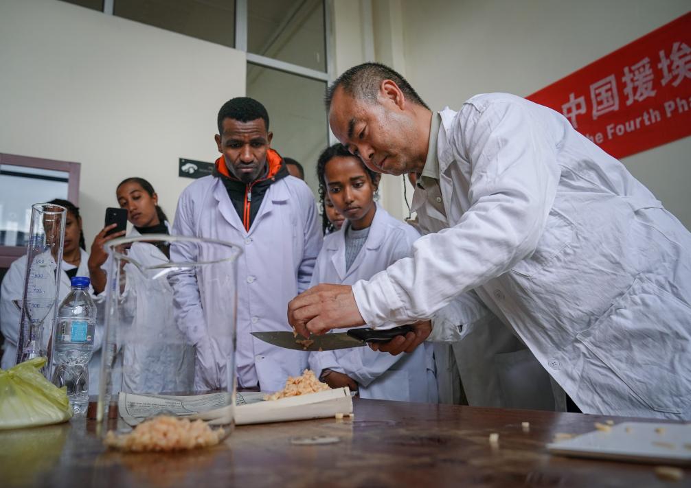 2025年8月20日,在埃塞俄比亞首都亞的斯亞貝巴,中方專家在亞的斯亞貝巴理工學(xué)院對大學(xué)生進(jìn)行菌種制作技術(shù)指導(dǎo)。新華社記者 韓旭 攝