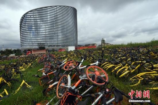 9月9日,現(xiàn)場堆積如山的共享單車。近半年來,位于昆明市盤龍區(qū)的閑置荒地里堆放了大量的共享單車,數(shù)量已超萬輛。中新社記者 李進紅 攝