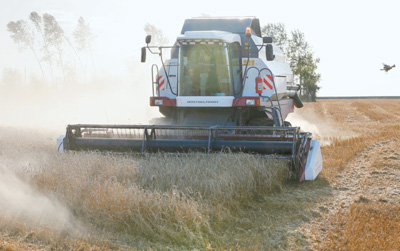 | 今年8月,在俄羅斯克拉斯諾亞爾斯克邊疆區(qū)的一個(gè)農(nóng)場(chǎng),收割機(jī)在收割小麥。 |