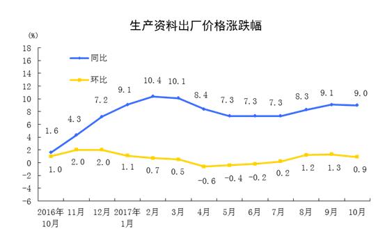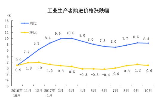 人民網(wǎng)北京11月9日電(李楠樺)國(guó)家統(tǒng)計(jì)局官方網(wǎng)站公布數(shù)據(jù)顯示,2017年10月份,全國(guó)工業(yè)生產(chǎn)者出廠價(jià)格同比上漲6.9%,環(huán)比上漲0.7%。工業(yè)生產(chǎn)者購進(jìn)價(jià)格同比上漲8.4%,環(huán)比上漲0.9%。1-10月平均,工業(yè)生產(chǎn)者出廠價(jià)格同比上漲6.5%,工業(yè)生產(chǎn)者購進(jìn)價(jià)格同比上漲8.4%。
