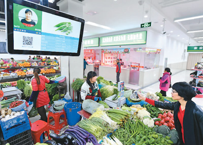 | 2017年11月29日,在安徽合肥瑤海區(qū)勝利智能農(nóng)貿(mào)市場(chǎng),市民在掃碼支付。 |