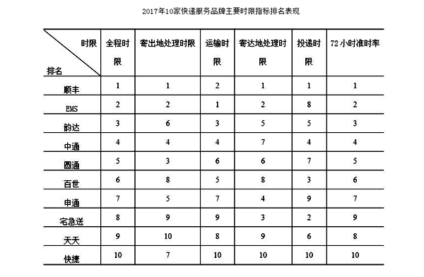 據(jù)了解,2017年快遞服務(wù)時(shí)限準(zhǔn)時(shí)率測(cè)試范圍覆蓋50個(gè)城市,包括全部省會(huì)城市、直轄市以及19個(gè)快遞業(yè)務(wù)量較大的重點(diǎn)城市。測(cè)試對(duì)象為2016年國內(nèi)快遞業(yè)務(wù)量排名靠前且服務(wù)水平較好的10家全網(wǎng)型快遞服務(wù)品牌,包括:郵政EMS、順豐速運(yùn)、圓通速遞、中通快遞、申通快遞、韻達(dá)快遞、百世快遞、天天快遞、宅急送快運(yùn)和快捷快遞。