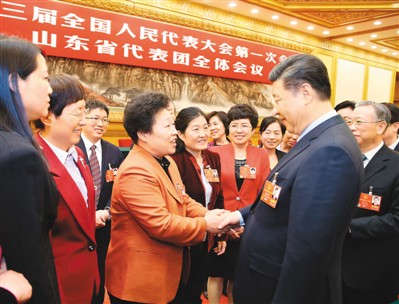 | 3月8日,中共中央總書記、國家主席、中央軍委主席習(xí)近平參加十三屆全國人大一次會(huì)議山東代表團(tuán)的審議。在“三八”國際勞動(dòng)?jì)D女節(jié)到來之際,習(xí)近平代表黨中央,向參加全國兩會(huì)的女代表、女委員、女工作人員,向全國各族各界婦女同胞,致以節(jié)日的祝賀和誠摯的祝福。圖為習(xí)近平同女代表親切交談。 |
