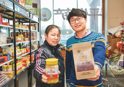 | 大學畢業(yè)后回到家鄉(xiāng)創(chuàng)辦電商公司的張偉和母親在新疆精河縣線下實體店展示自家出售的特產(chǎn)。 |