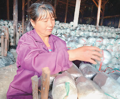 | 周秀娥在菇棚內(nèi)察看菌筒。 |
