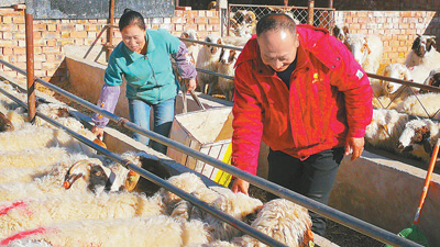 圖為武玉民和老伴正在喂羊。