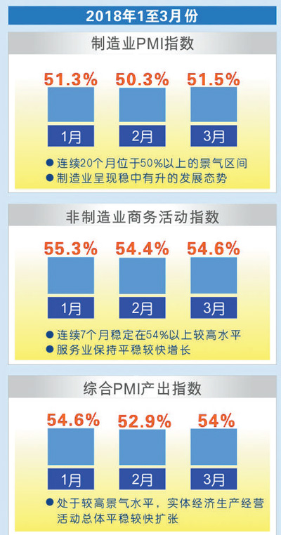 今年以來,面對錯綜復雜的國際國內(nèi)環(huán)境,各地區(qū)各部門認真貫徹黨中央決策部署,堅持穩(wěn)中求進工作總基調(diào),不斷深化改革開放,有效激發(fā)內(nèi)生動力和活力。從作為先行指標的1—3月份采購經(jīng)理指數(shù)看,中國經(jīng)濟延續(xù)了去年以來穩(wěn)中向好發(fā)展態(tài)勢,發(fā)展預期穩(wěn)定向好。