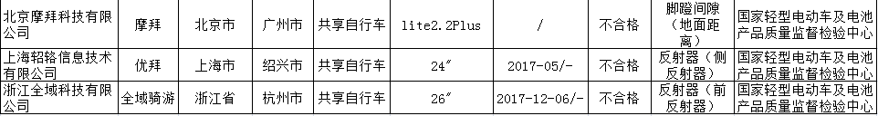 2017年共享自行車產(chǎn)品質(zhì)量國(guó)家監(jiān)督專項(xiàng)抽查不合格產(chǎn)品及其企業(yè)名單(來(lái)源:國(guó)家質(zhì)檢總局)