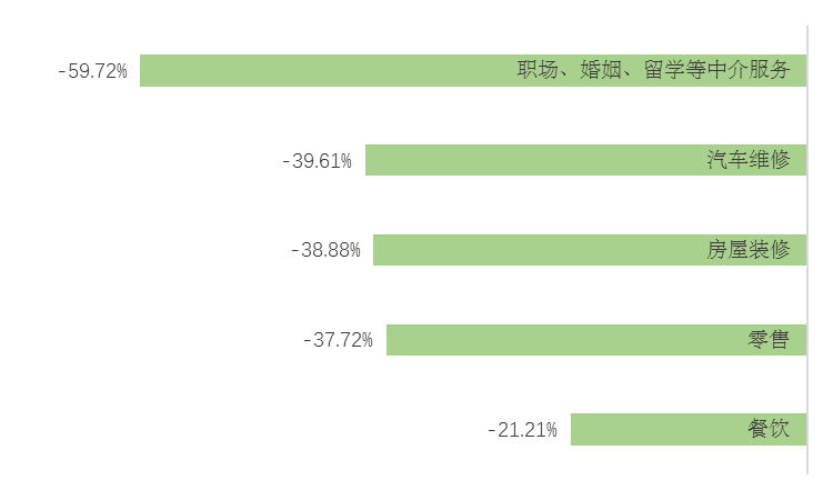 兩會召開期間(3月3日至3月20日),全國價格舉報受理量保持平穩(wěn),市場價格秩序良好。其中,民生服務類價格問題受理案件與歷史同期相比減少33.03%,與上月相比減少23.46%。其中,同比下降最多的五個行業(yè)是職場婚姻留學等中介服務、汽車維修、房屋裝修、商品零售與餐飲,跌幅分別為-59.72%、-39.61%、-38.88%、-37.72%、-21.21%。