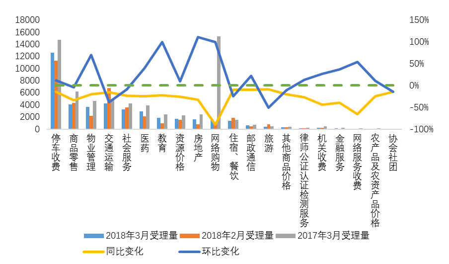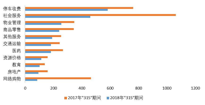 從熱點行業(yè)分布來看,“3·15”期間停車收費、社會服務、物業(yè)管理、商品零售等行業(yè)位居前列;與2017年同期相比,網絡購物、社會服務和房地產等行業(yè)受理量下降幅度較大。
