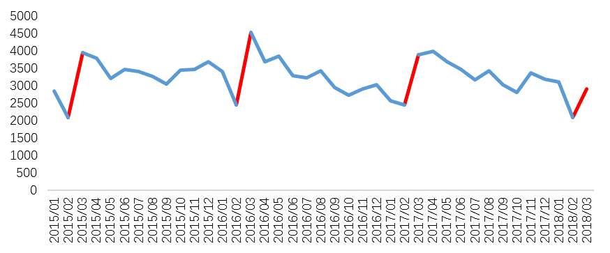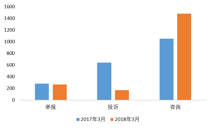 報告顯示,2018年3月平臺共受理價格舉報、投訴、咨詢共計 51432件,環(huán)比上升12.9%,同比下降40.5%,主要是由于網購行業(yè)舉報受理量同比下降85%。其中,價格舉報6941件,環(huán)比上升20%;價格投訴5091件,環(huán)比上升0.4%;價格咨詢39400件,環(huán)比上升13.5%。